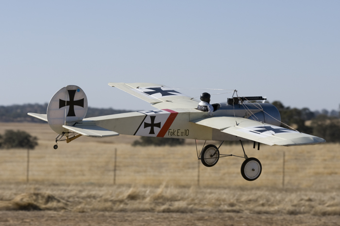 John Stoney's Eindecker. Saito three cylinder four stroke radial engine, Futaba radio.